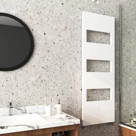 Create an instant focal point in your bathroom with the minimalist styling of the white Arezzo designer radiator. Features a unique bold design which provides plenty of space for all your towels. Manufactured from durable steel with a quality eye-catching white finish, this stylish designer radiator provides superb heat output which will gently warm towels and your bathroom.