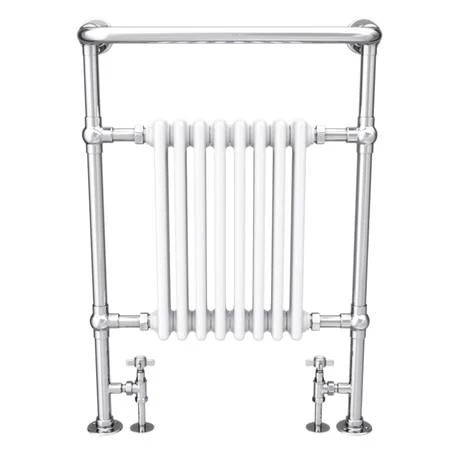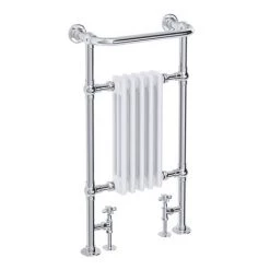 The Chatsworth Savoy Traditional Radiator evokes luxury and timeless elegance with its classic design. Manufactured from steel, it heats quickly and stays warm for longer. This compact towel rail radiator is just 673mm wide, making it suitable for cloakrooms, bathrooms and kitchens where space is at a premium. It features a traditional towel rail that extends over the radiator – hang your towels to dry on it without compromising the heat flow around the room. It’s supplied with two chrome radiator valves with white ceramic caps in the centre of the crosshead handles, perfectly matching the white radiator body.