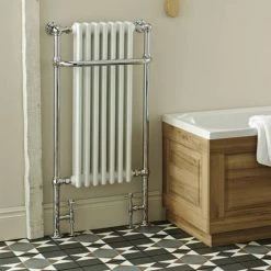 Achieve a Victorian inspired look in your bathroom – as well as warming your socks – with this charming Chatsworth Savoy Traditional Towel Rail. While it certainly looks retro, this 628mm wide towel rail radiator offers modern and efficient heating. It’s a great place for keeping towels toasty, either on the white enamel finished centre section or draped over the striking chrome plated frame. It comes with vintage style cross head valves as well as a mains lead, so you can still keep your towels warm throughout the warmer months.