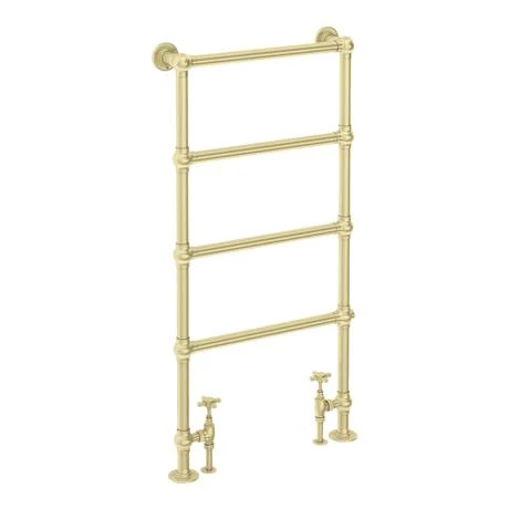 A quality traditional brushed brass floor mounted towel rail with stylish ball joints, it’s classic design would look great in any bathroom. Manufactured to the highest standards and constructed from durable steel. It delivers excellent heat and is ideal for warming towels when in the bath or shower. Supplied with fixings.