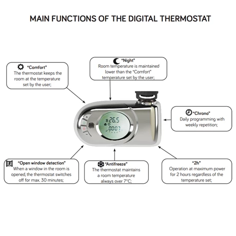 Towel rail comes with a chrome finish digital thermostat featuring five operational modes: